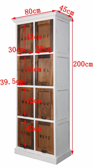 Skab i antik hvidbemalet træ med otte låger, der klappes opad. Hver låge er markeret med bogstaverne A-Z og har greb i patineret messing. Et unikt og dekorativt møbel med karakter og praktisk opbevaringsplads.