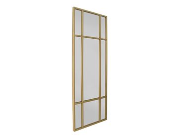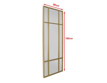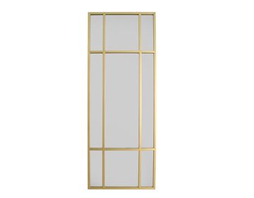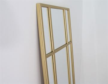 Det store vægspejl er indrammet af en guldfarvet jernramme, som tilfører et sofistikeret og luksuriøst udtryk – perfekt til både moderne og klassiske hjem. Brug det i entreen for at skabe en indbydende stemning, i soveværelset som fuldkropsspejl eller som et dekorativt statement i stuen. Spejlet kan stå op ad væggen for et afslappet look eller hænges op både lodret og vandret, alt efter rummets stil og behov.