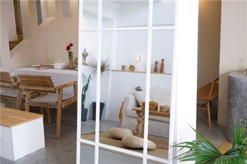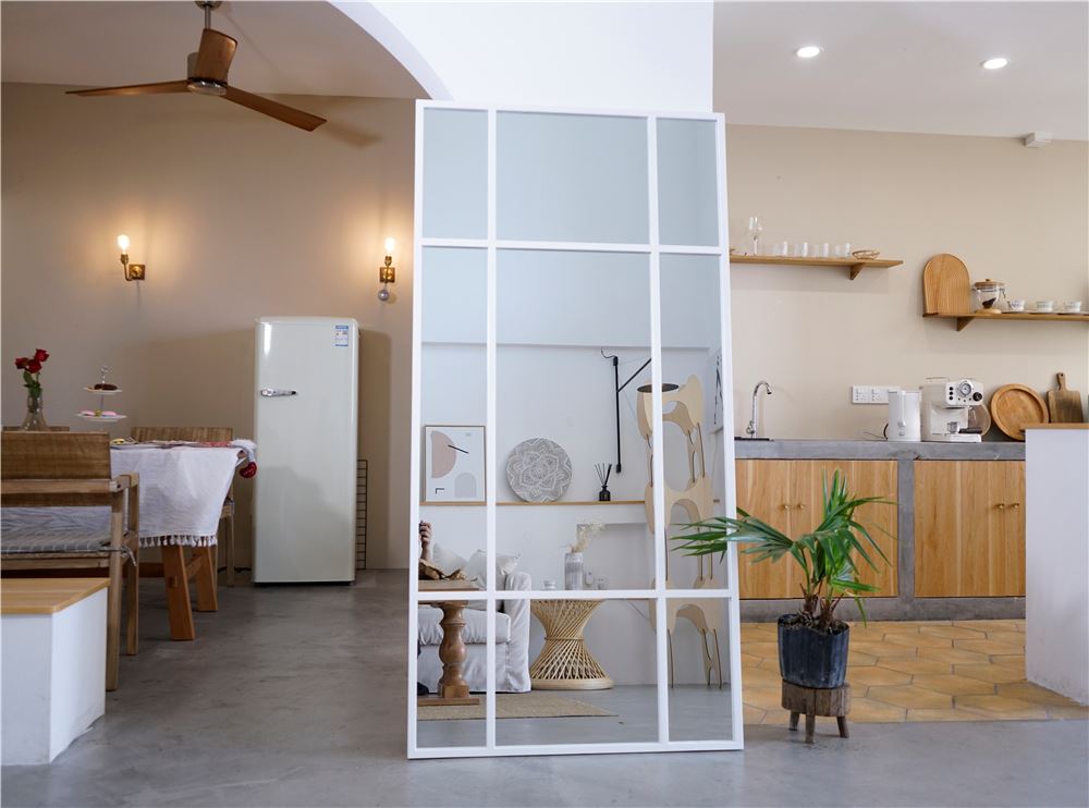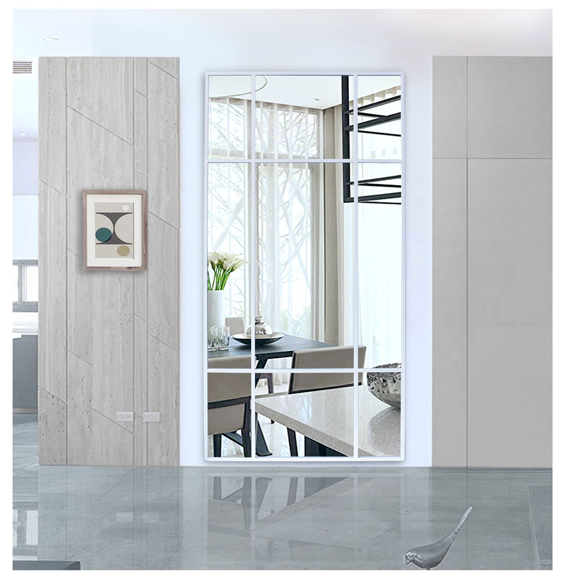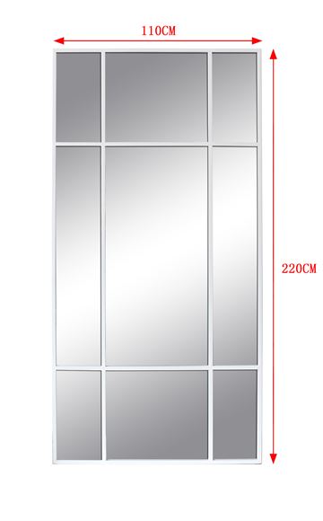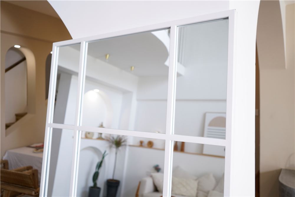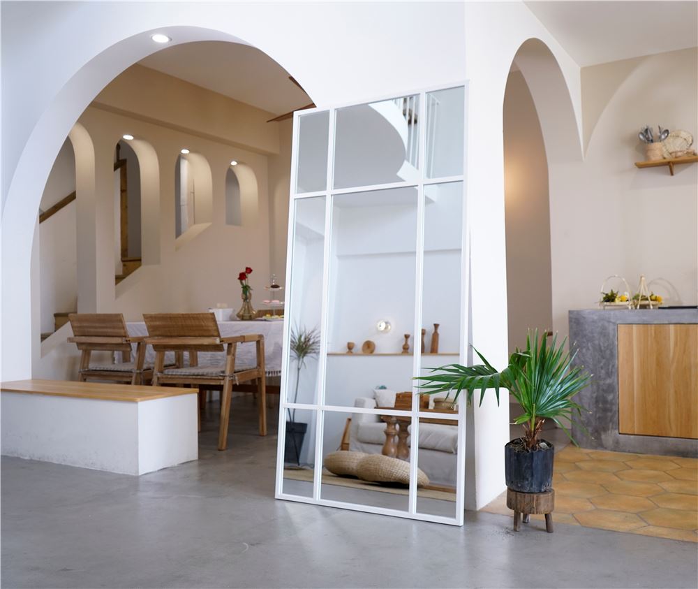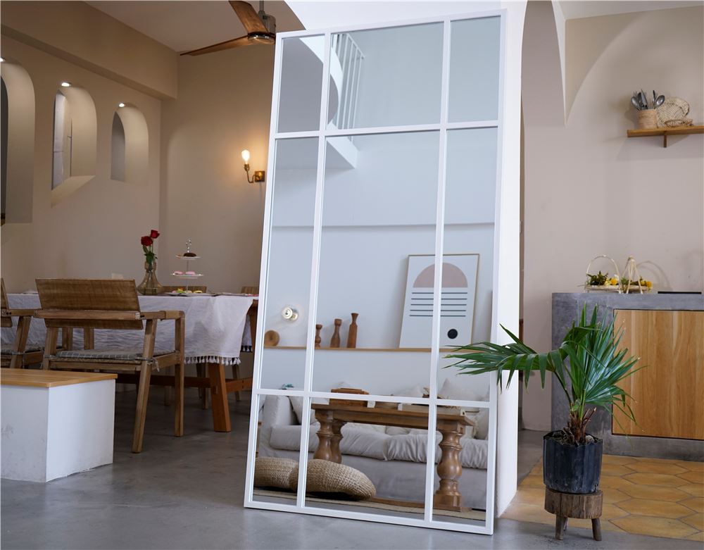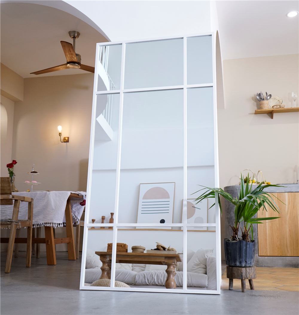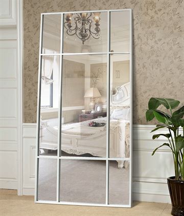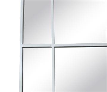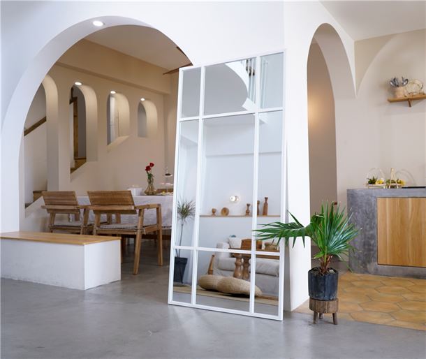 Et stort og stilrent spejl med hvid jernramme, der tilfører indretningen et moderne og råt præg. Den minimalistiske, industrielle stil gør det ideelt til både soveværelset, entreen og stuen, hvor spejlet åbner rummet og skaber en følelse af lys og rummelighed.