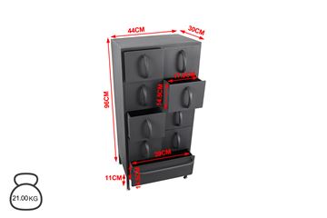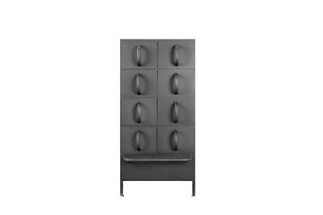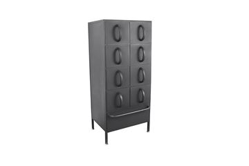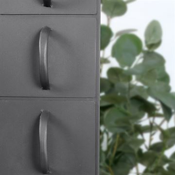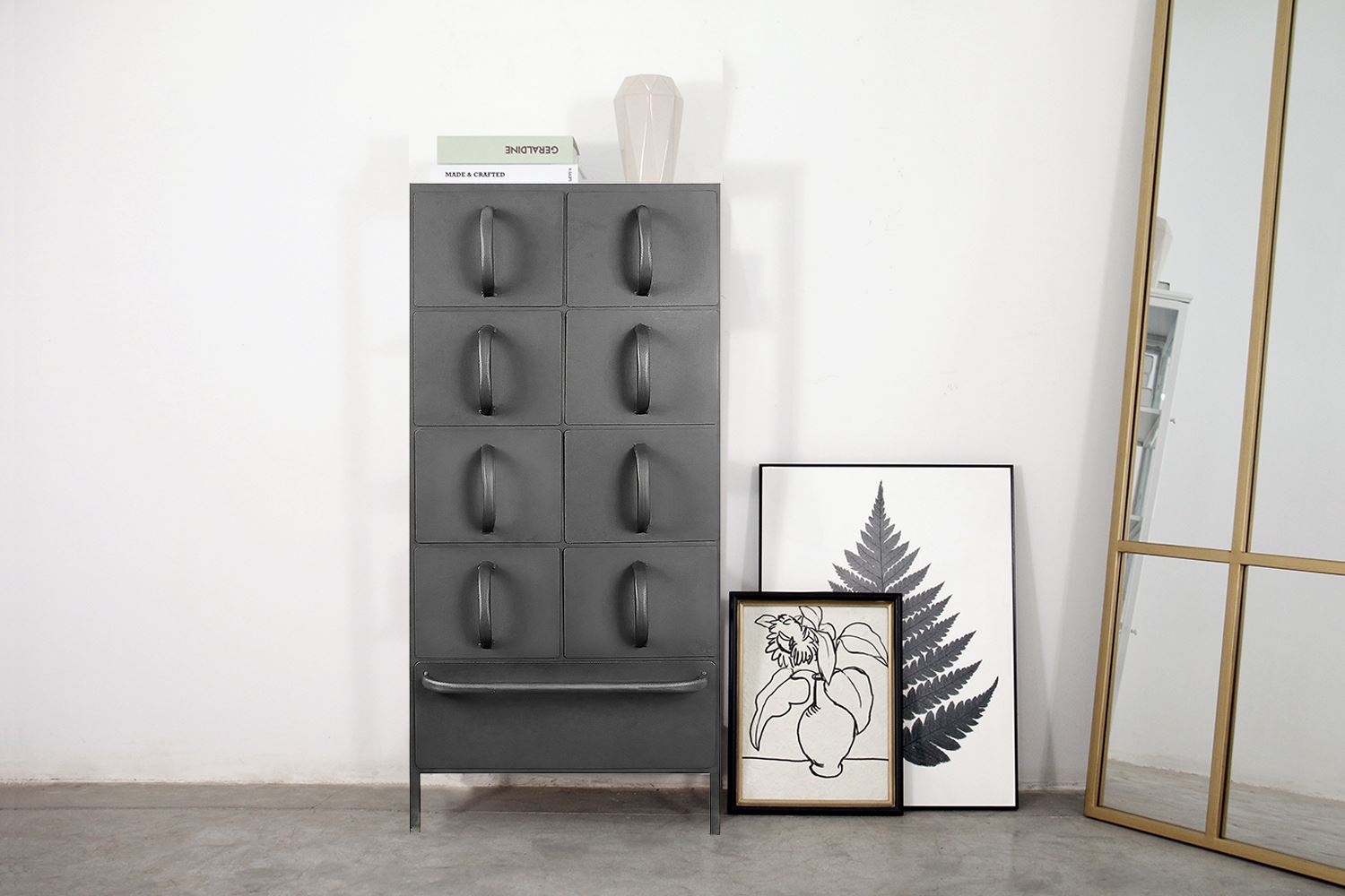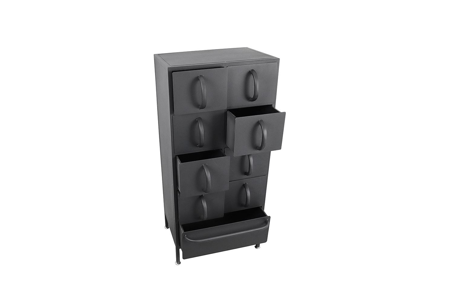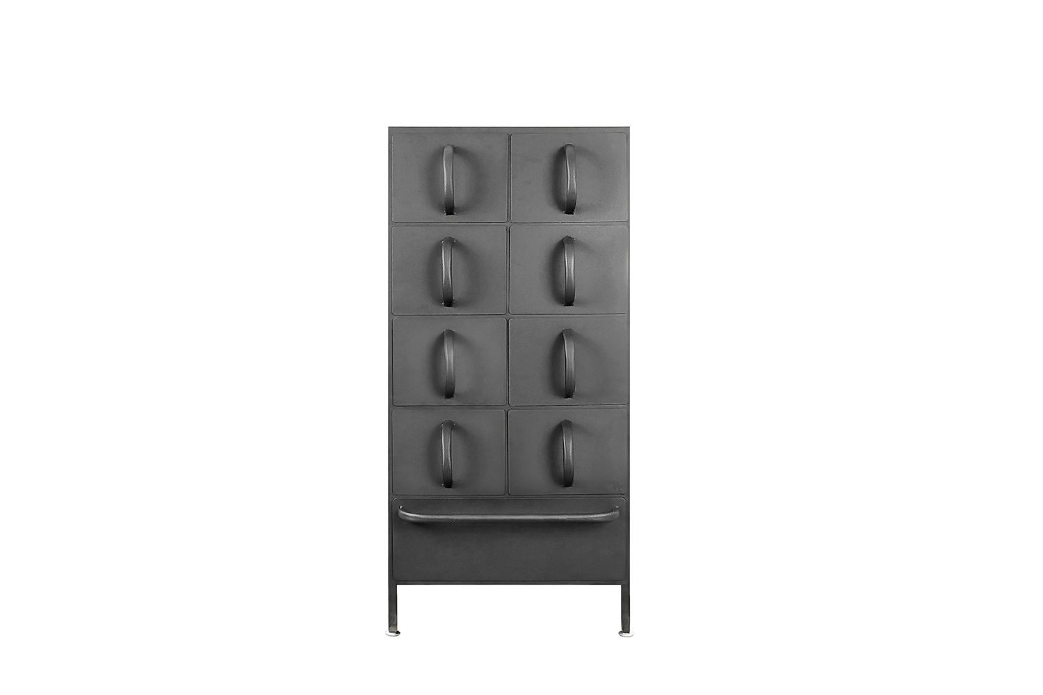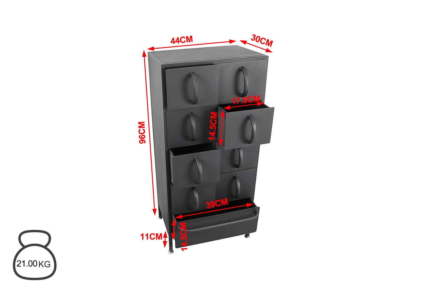 Kommode i sortmalet metal med 8 mindre skuffer, nederst 1 bred skuffe. Industrielt design. Kommer samlet - se billed for alle mål. H.96 x B.44 X D.30 cm. Vægt 21 kg