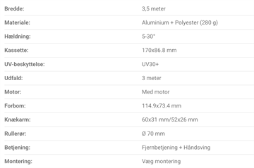 For at forlænge markisens levetid anbefales det at køre den ind ved regn, sne, frost, kraftig vind eller tordenvejr.