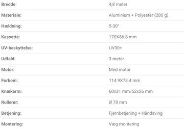 For at forlænge markisens levetid anbefales det at køre den ind ved regn, sne, frost, kraftig vind eller tordenvejr.