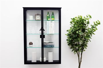 Væghængt Vitrineskab udført i sortlakeret jern. To låger med glas, samt glas i siderne. Greb af sortlakeret jern. Skabet er 160 cm højt med 3 justerbare glas hylder. Industrielt design. H. 120 cm. B. 80 cm. D. 25 cm.