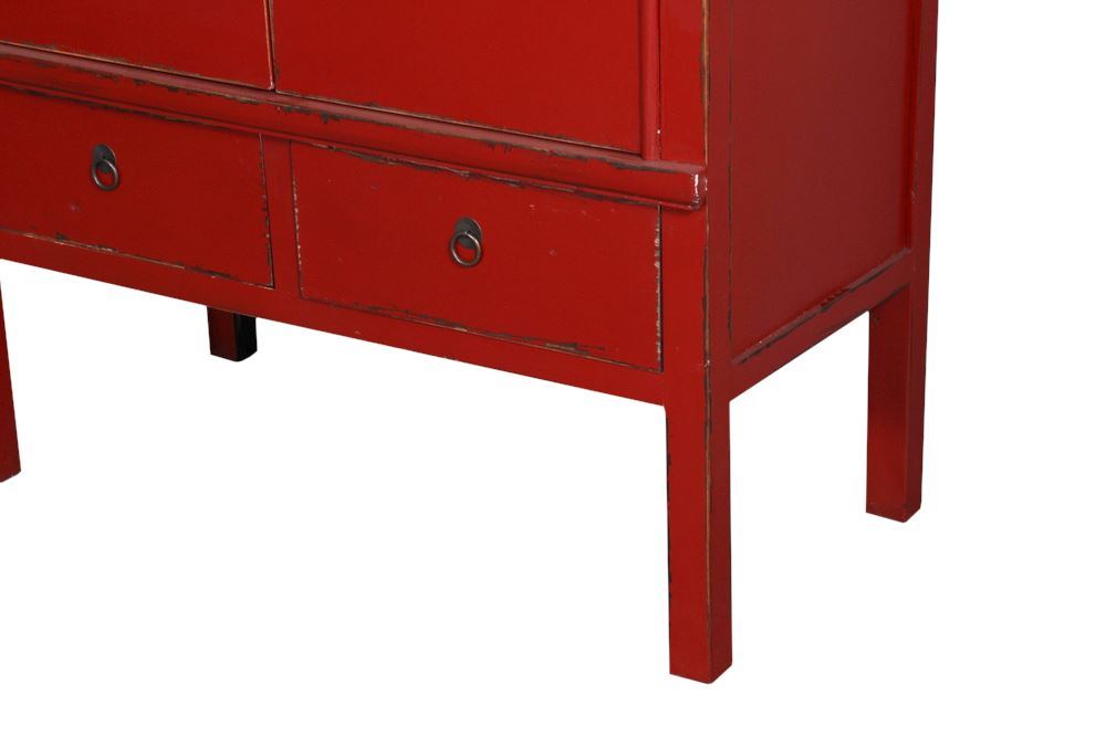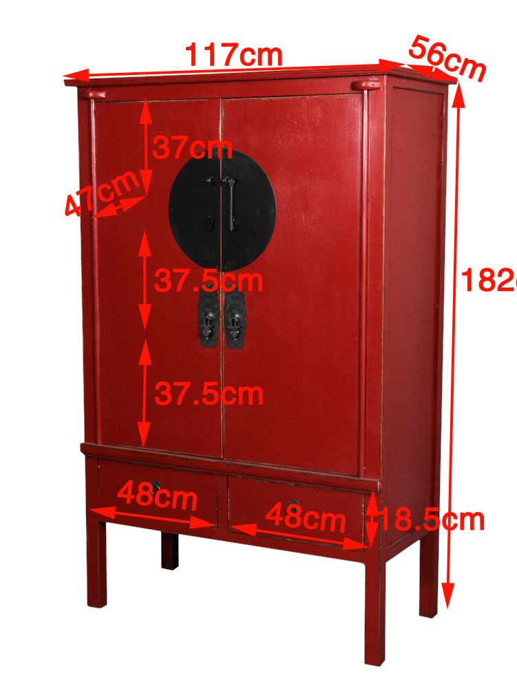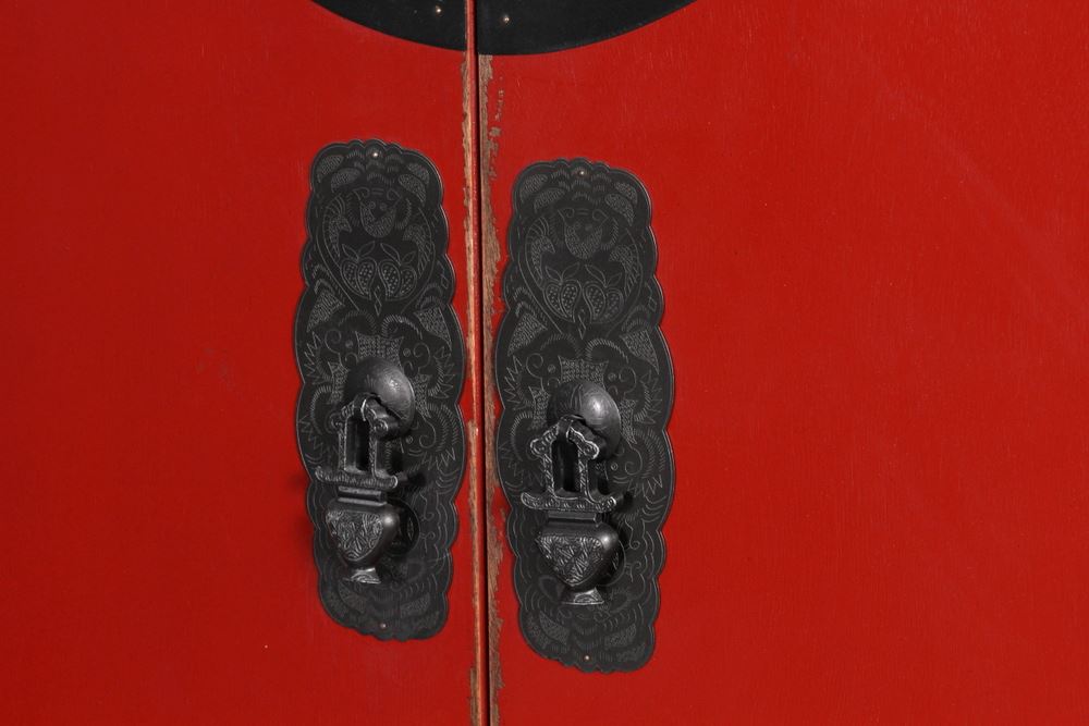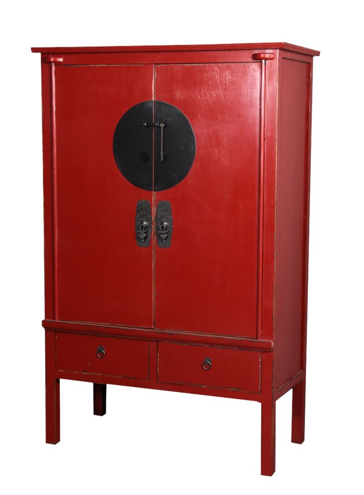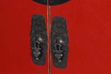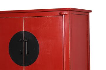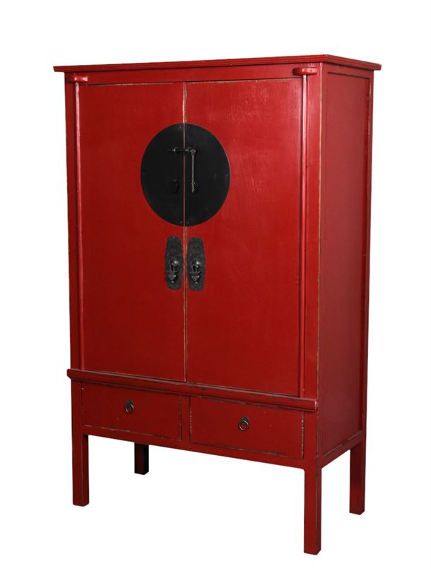 Lad dette store kinesiske brudeskab blive rummets naturlige blikfang. Den dybe røde antikbemaling giver skabet et varmt, orientalsk udtryk, mens de sorte metalbeslag og den karakteristiske runde plade på fronten tilfører et elegant præg.