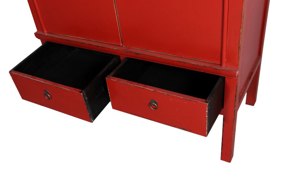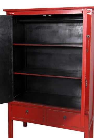 Bag de to låger er der god plads til service, tøj, sengetøj eller kasser, og de to skuffer i bunden er ideelle til mindre ting, du gerne vil have lige ved hånden. Indvendigt er skabet sortbemalet, hvilket skaber en smuk kontrast til den røde yderside og giver et roligt, gennemført look, når dørene åbnes.
