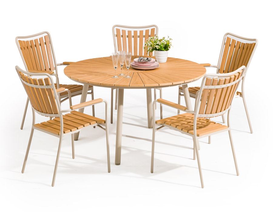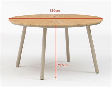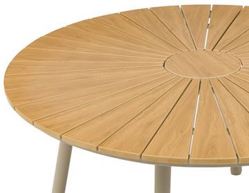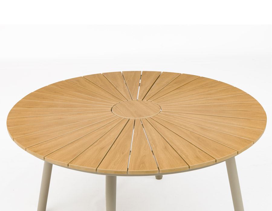 Skab en indbydende samlingsplads på terrassen eller altanen med et rundt havebord i tidløst design. Den slidstærke nonwood-bordplade kombinerer trælook med praktisk hverdagsbrug, mens stellet i pulverlakeret lattefarvet aluminium giver et stilrent og luftigt udtryk. Benenes stilleskruer gør det nemt at finjustere, så bordet står sikkert, uanset underlag.