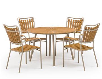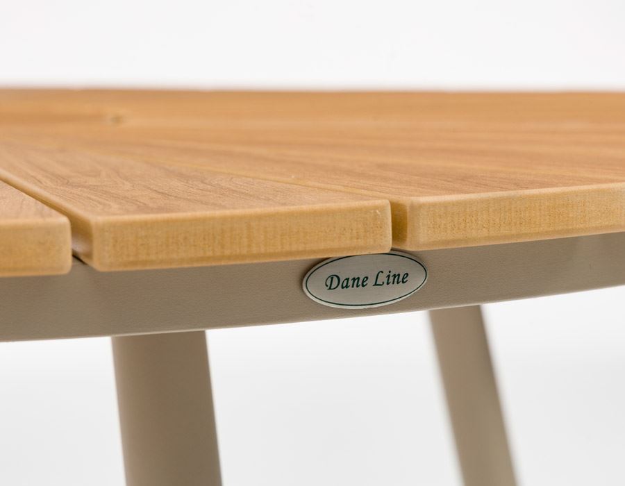 Skab en lys og indbydende ramme på terrassen med dette elegante sæt med rundt bord og 4 stole. Sættet er udført i pulverlakeret Lattefarvet aluminium og toppet med slidstærkt nonwood i et smukt trælook – et stilrent udtryk, der passer perfekt til både moderne og klassiske uderum.