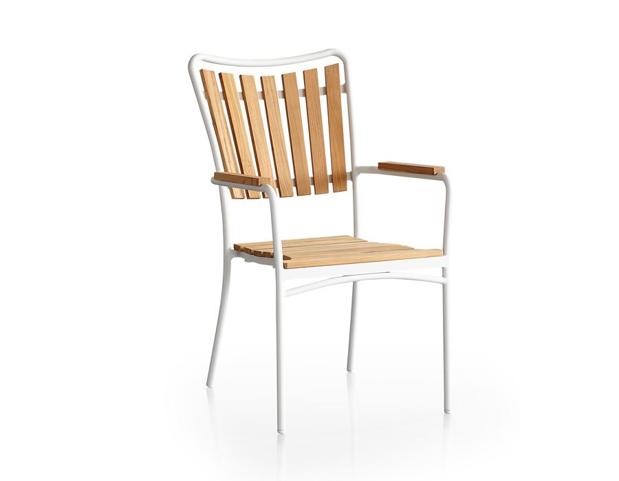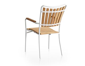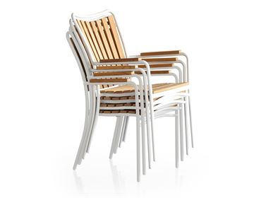 Samt seks armstole/stabelstole med stel af pulverlakeret modehvid aluminium. Ergonomisk sæde og ryg af plantage teak.