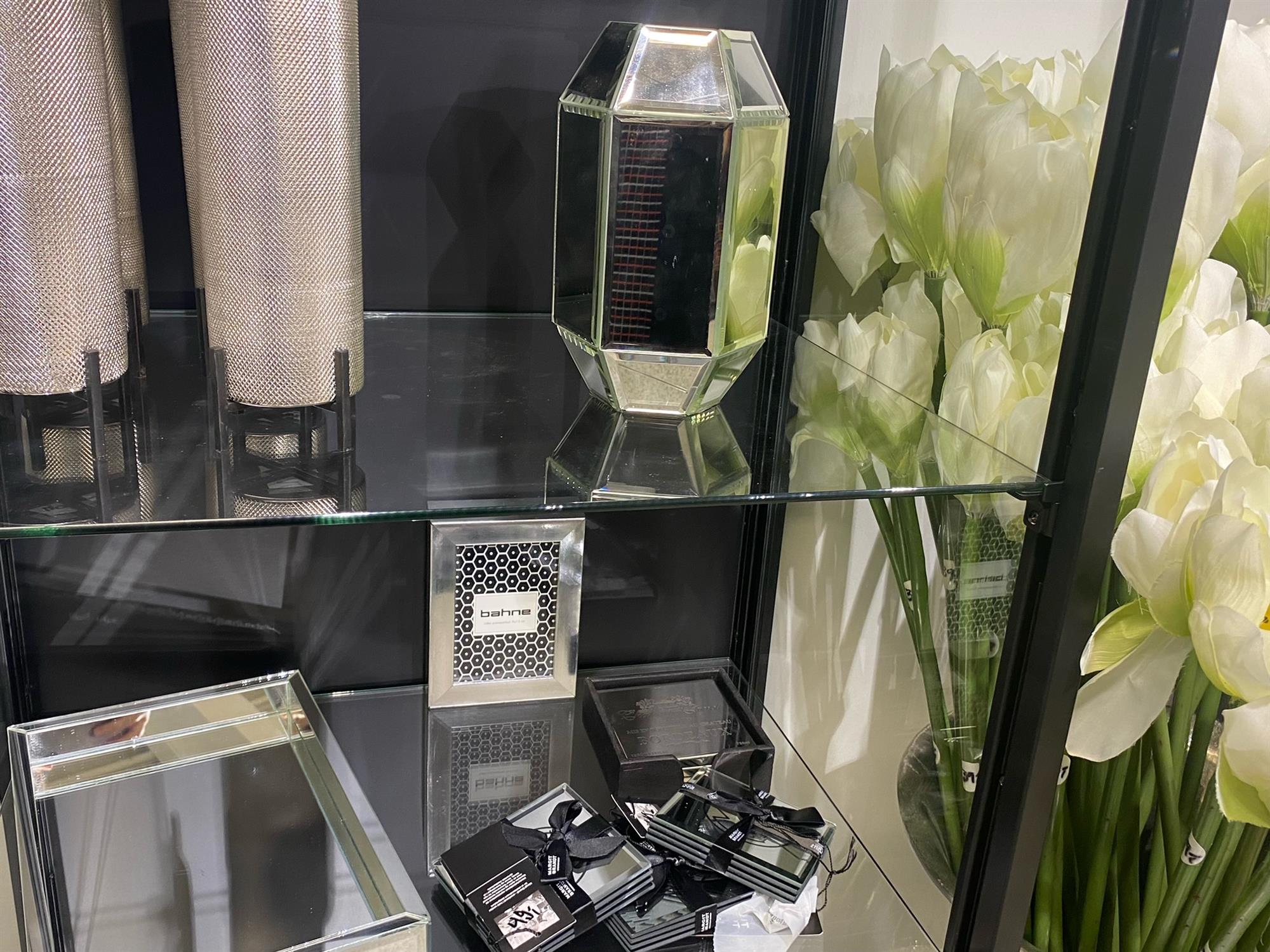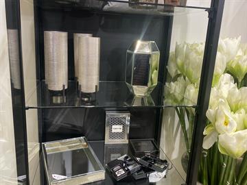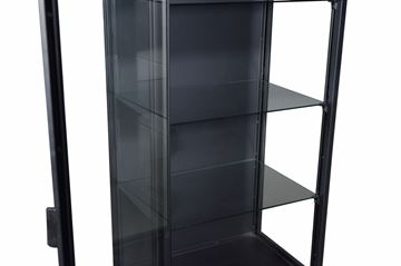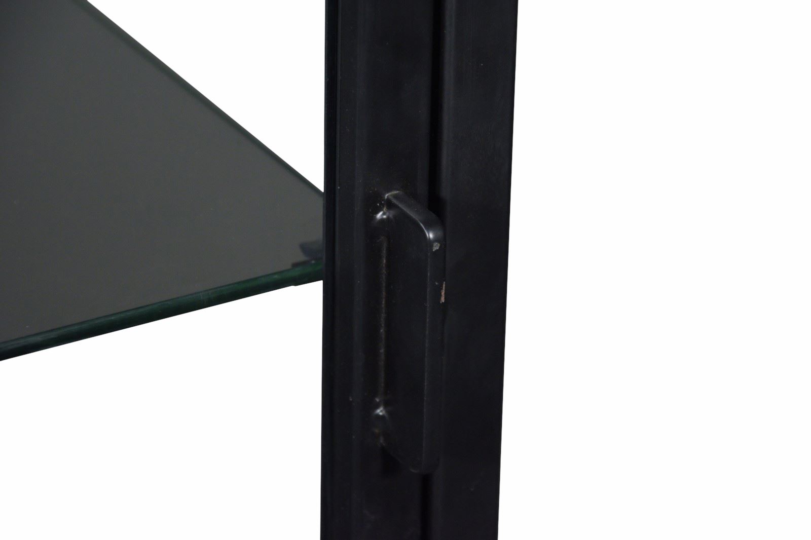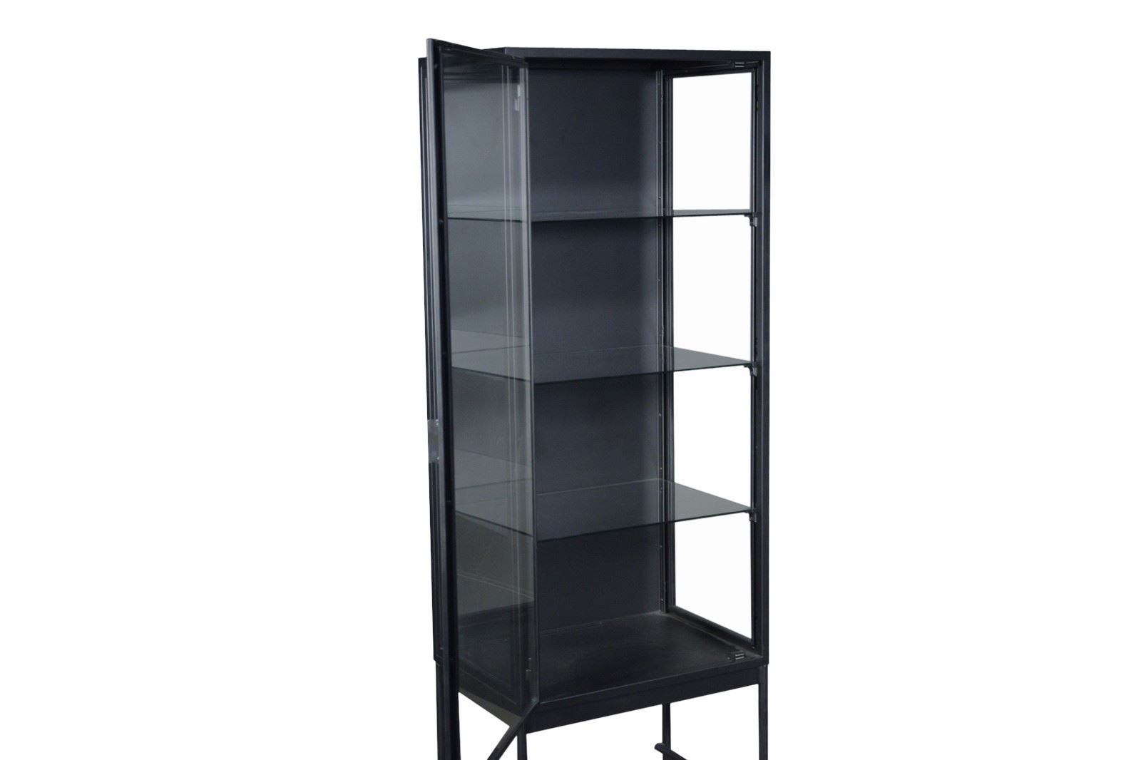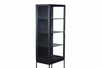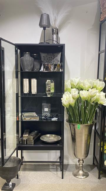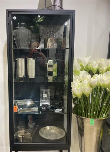 Dette vitrineskab i sortlakeret jern giver din indretning et råt, stilrent udtryk. De slanke profiler og glas i både låge og sider lader lyset spille frit gennem skabet og fremhæver alt, hvad du vælger at stille frem.
