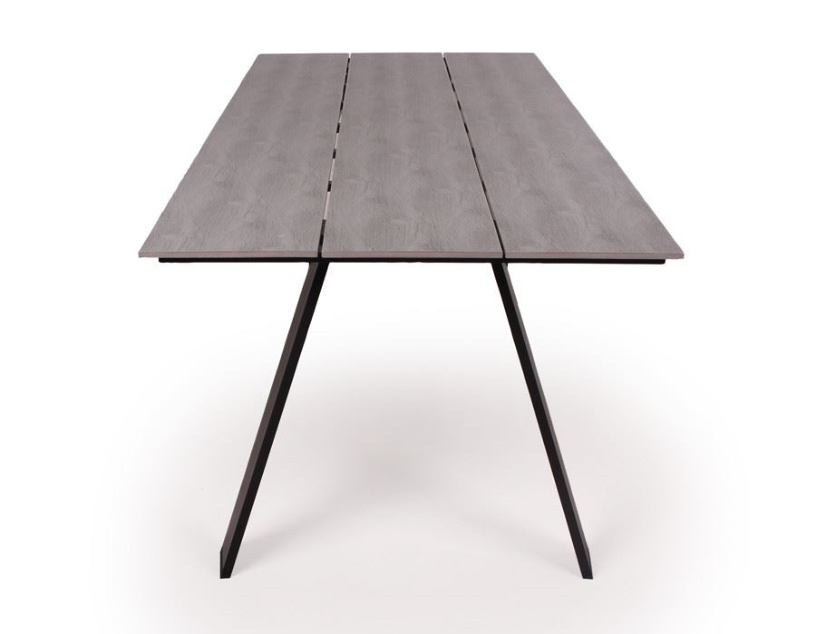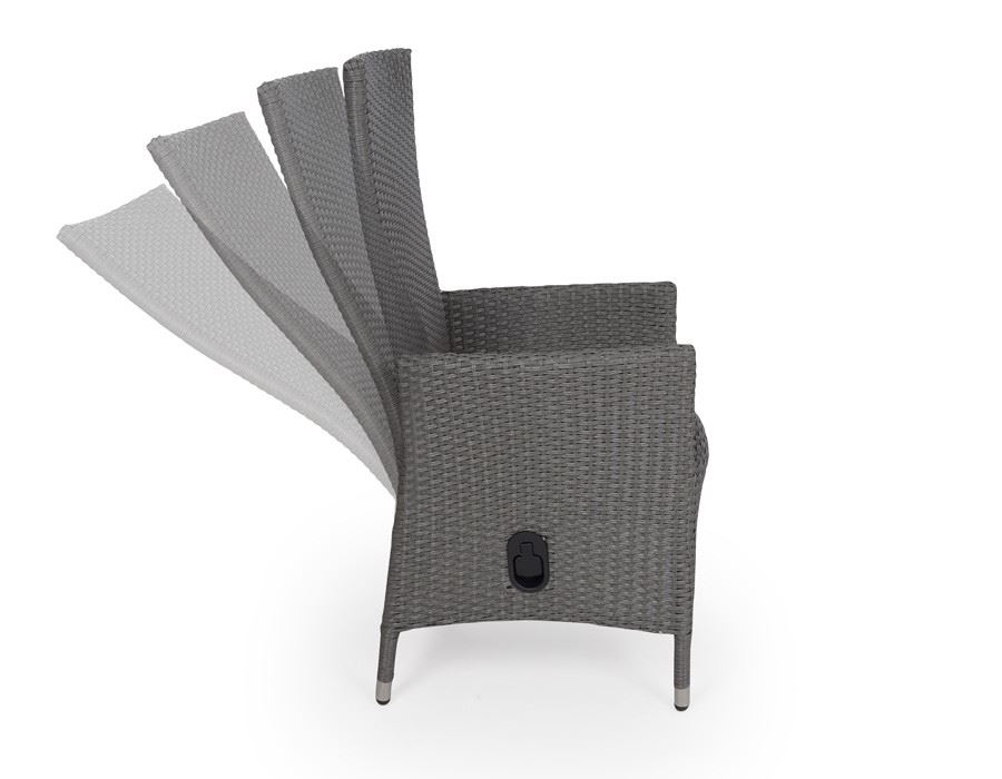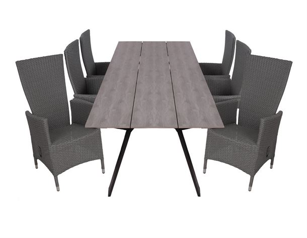 Sættet består af seks Paris positionsstole i grå polyrattan-flet samt et Diva bord med sort aluminiumsstel og ekstra kraftige grå nonwood-lameller.