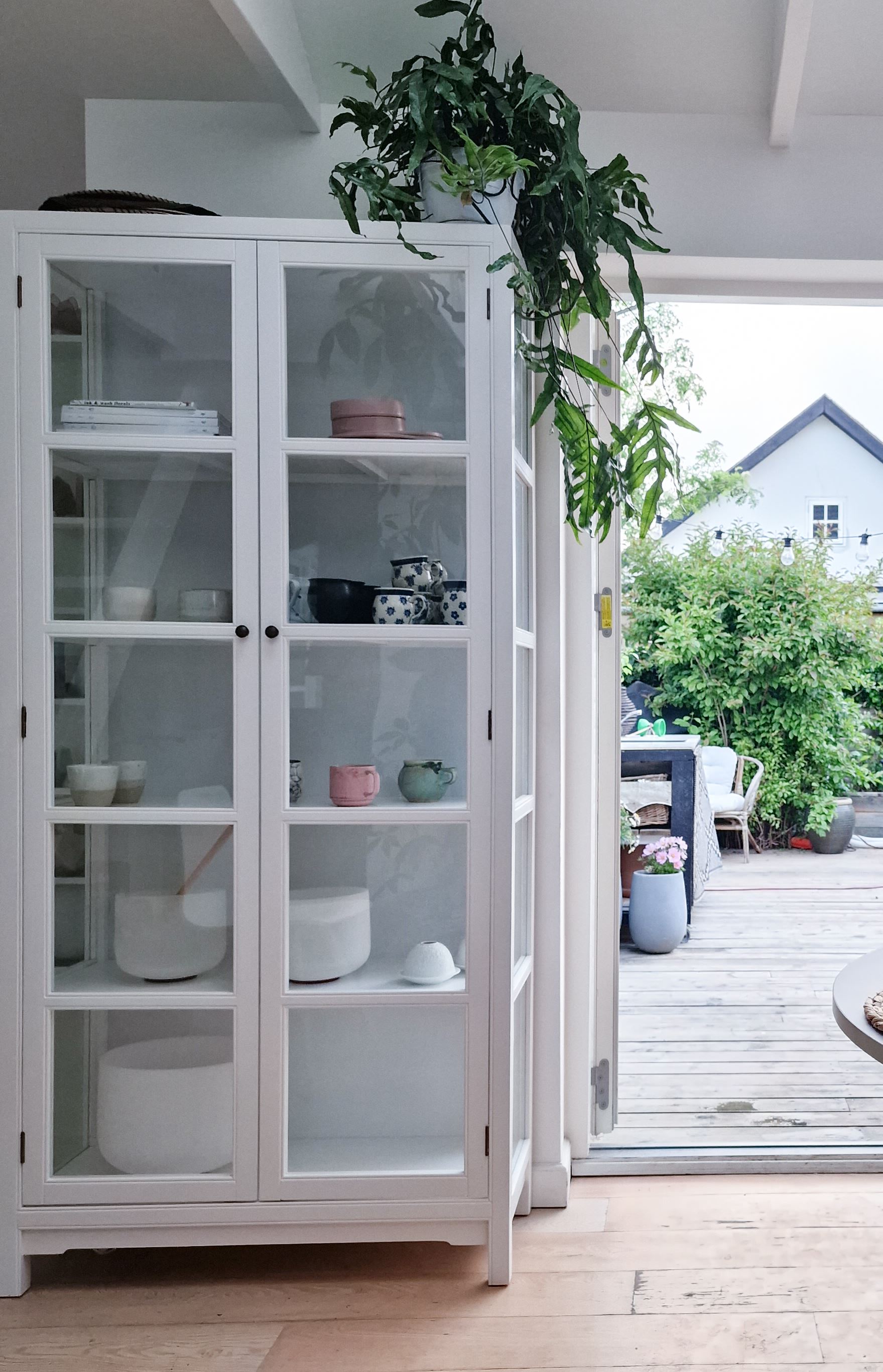 Den klassiske front med glaslåger giver et flot indkig til de rummelige hylder, perfekte til både service, keramik og dekorative detaljer. Indvendigt finder du en praktisk hyldeinddeling: øverste og nederste hylde med 37 cm i højden og tre midterhylder med 33 cm, så der er god plads til både høje og lave genstande.