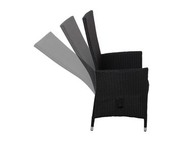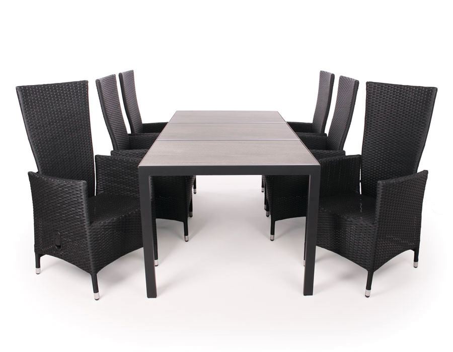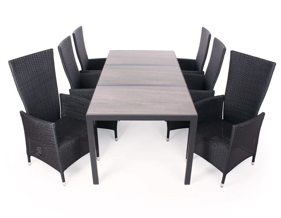 Eksklusivt havemøbelsæt bestående af seks sorte Paris-stole i polyrattan med justerbar ryg og et let, men solidt aluminiumsstel. Sættet inkluderer et Fanø bord med aluminiumsstel og tre elegante plader i grå keramik, der sikrer både holdbarhed og et moderne udtryk.