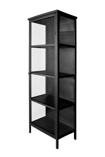 Vitrineskab udført i sortlakeret jern.Låge med glas,samt glas i siderne.Greb af sortlakeret jern.Skabet er 165 cm højt med 4 jern hylder. Industrielt design.