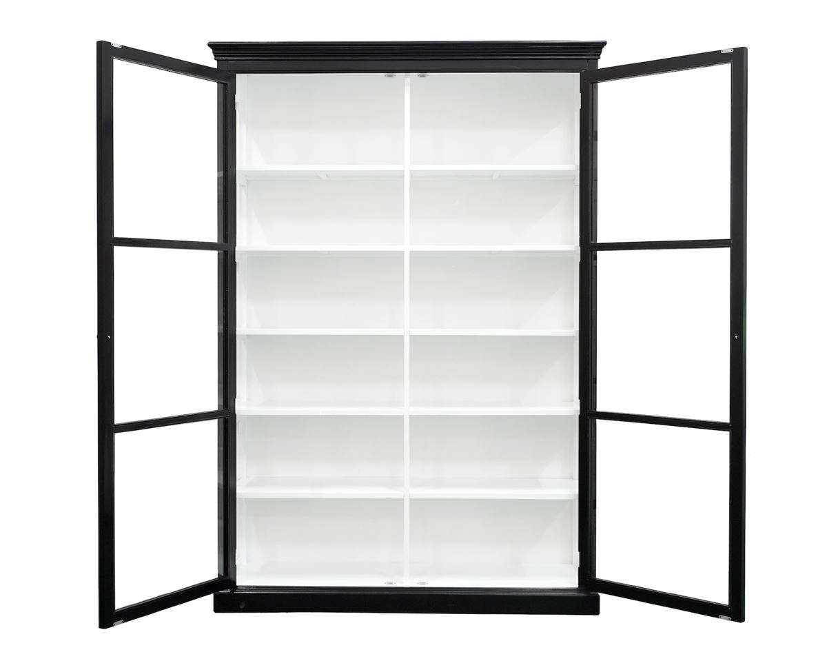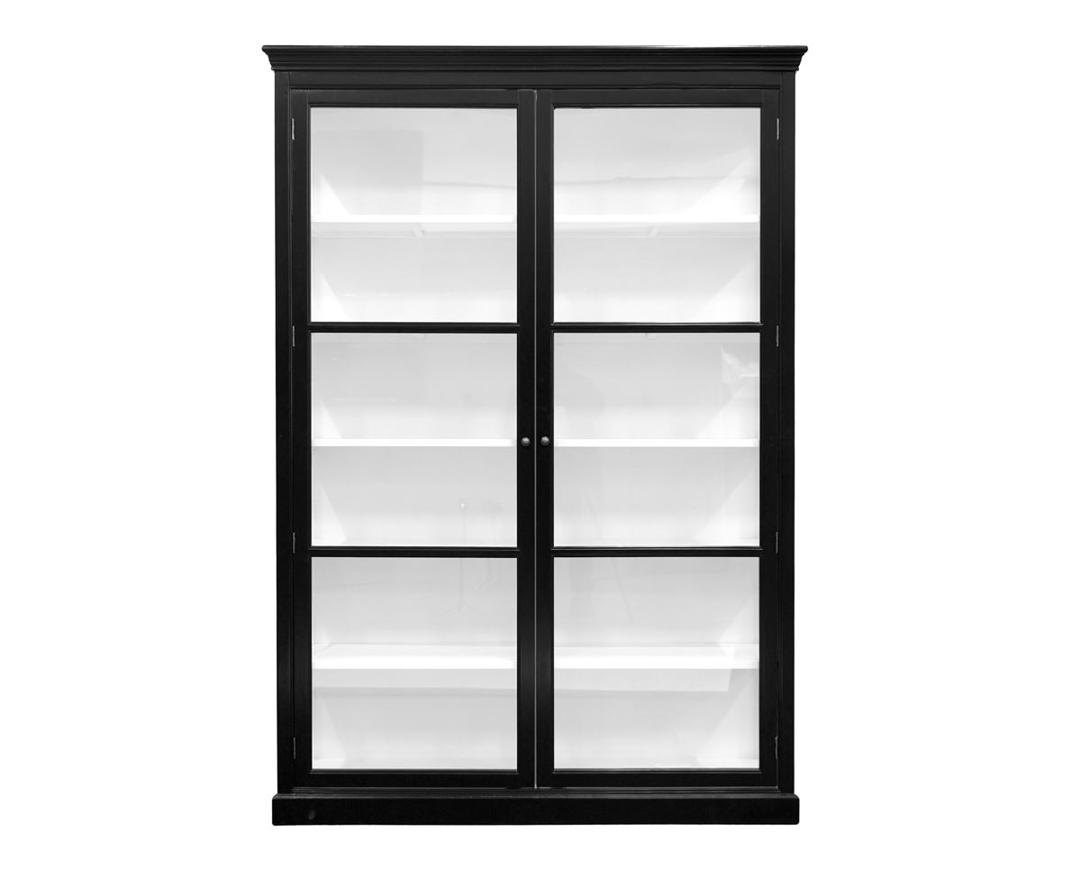 Stilfuldt vitrineskab i sortmalet træ med hvid indvendig finish. Udstyret med to glaslåger og fem hylder, smukke profilerede detaljer og metalgreb. Perfekt til at fremvise dine yndlingsting med karakter og charme.