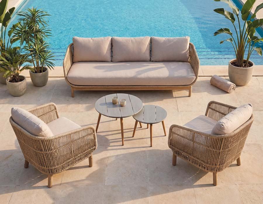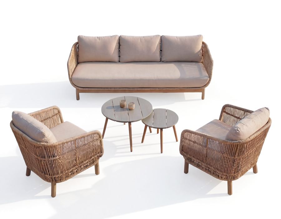 Sofa og stole er fremstillet i akacietræ og beklædt med flettet reb i polyester, som giver et moderne og luftigt udtryk. De medfølgende hynder har en vandafvisende airflow-konstruktion, der sikrer høj komfort og hurtig tørring, velegnet til udendørs brug.