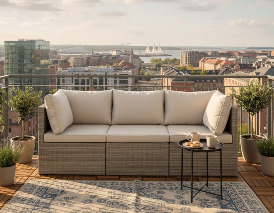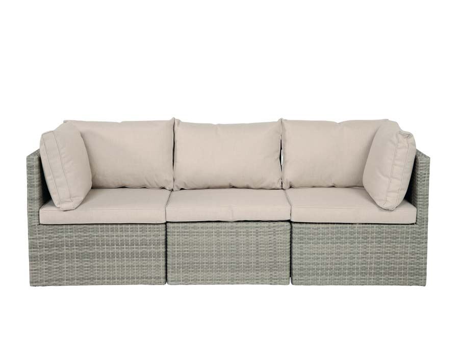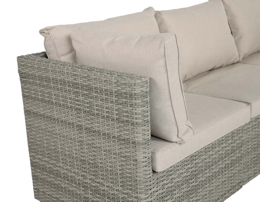 Isla 3-personers modulsofa i lys grå flet kombinerer komfort, fleksibilitet og et moderne udtryk, perfekt til både små og store uderum. Sofaen måler 192 × 60 cm og består af to hjørnemoduler og ét mellemmodul, som tilsammen skaber en rummelig og afslappende loungeplads til terrasse, altan eller udestue.