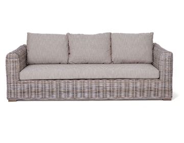 Superflot 3-personers sofa i kraftig naturrattan med lækre sandfarvede hynder, der sikrer høj komfort.