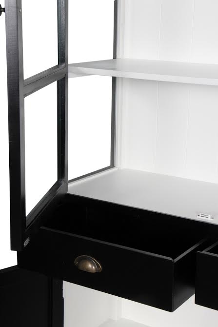 Helmalet sort Vitrineskab, udført i sortbemalet træ, indvendig hvidmalet. Profileret top. Greb af patineret messing. Øverst to glaslåger hvor bag hylder, to skuffer samt to låger hvor bag hylder. H. 210 cm. B. 110 cm. D.40 cm
