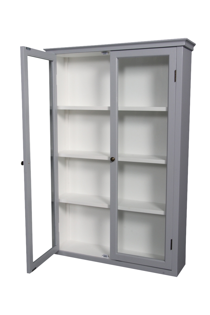 Gråt helmalet Væghængt skab, indvendig hvidmalet, front med to glaslåger, bag hvilke tre hylder.