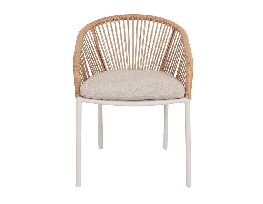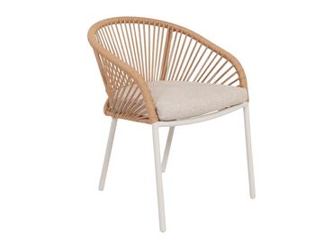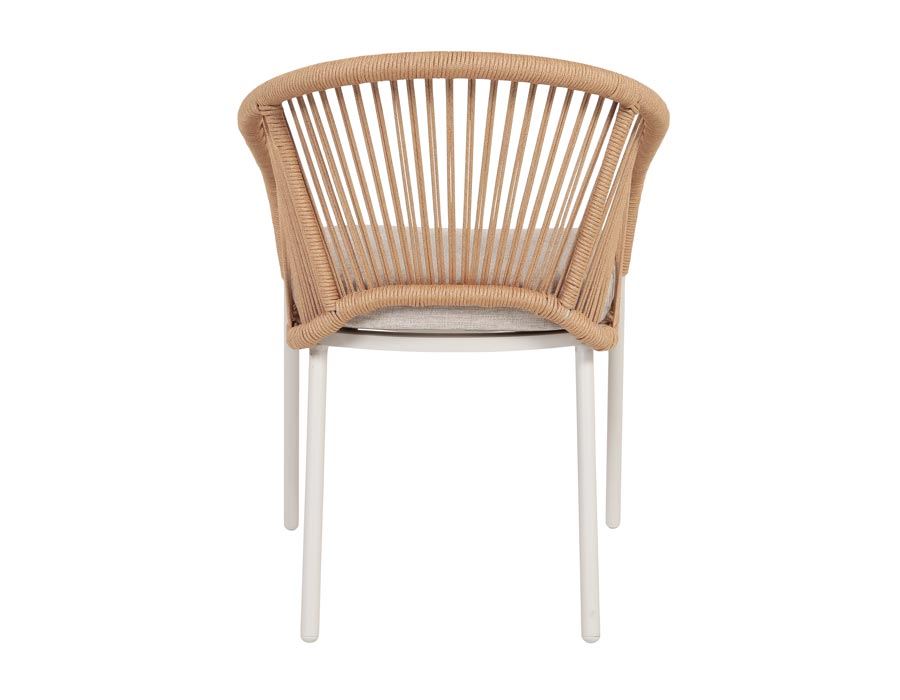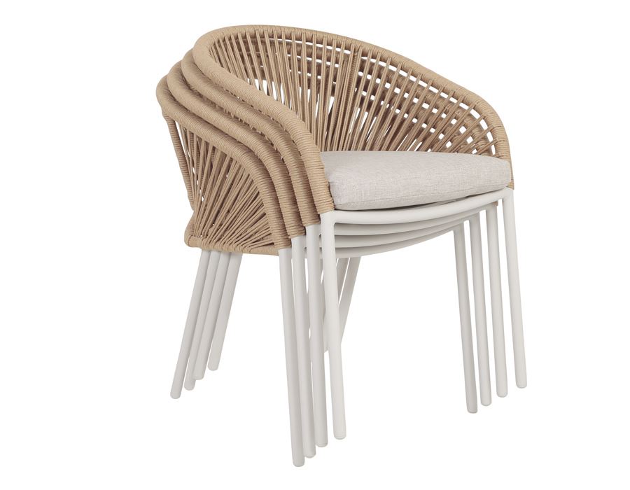 Stolene har et moderne, luftigt design med flettet look i lyse naturtoner og slanke ben, der matcher bordets stel. De ergonomiske former giver en behagelig siddeoplevelse, uanset om det er til en hurtig frokost i solen eller lange hyggelige aftener med gæster.