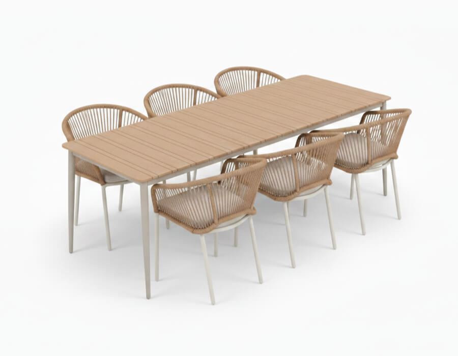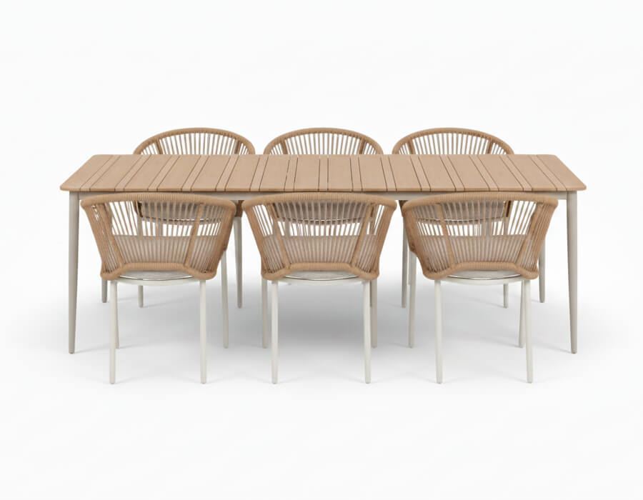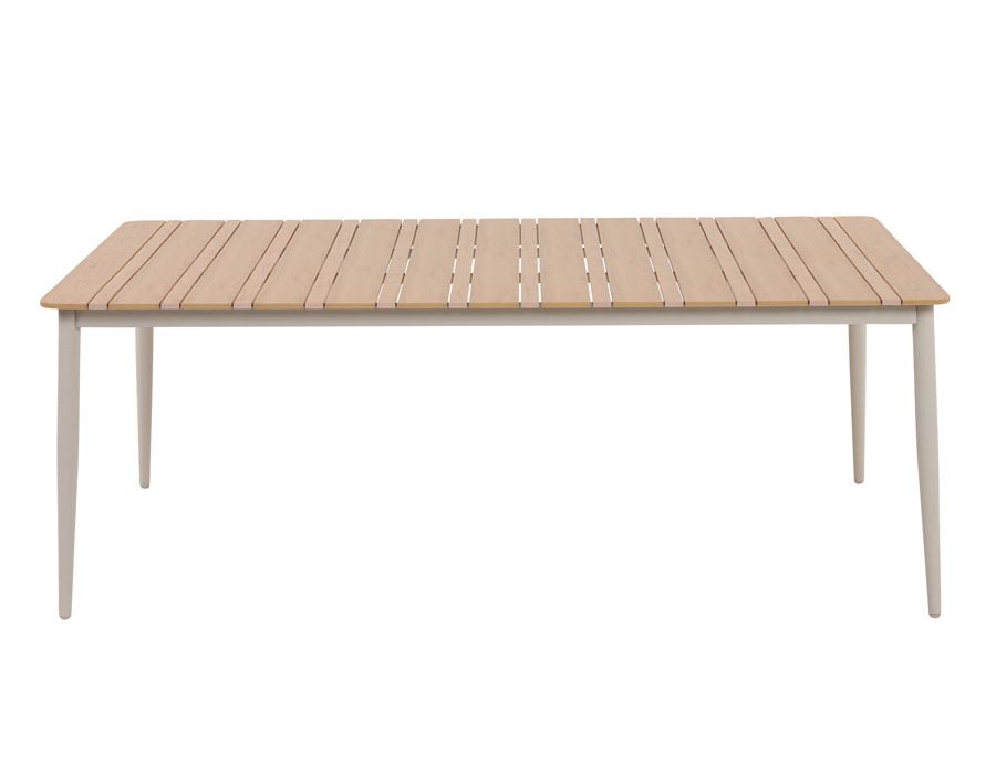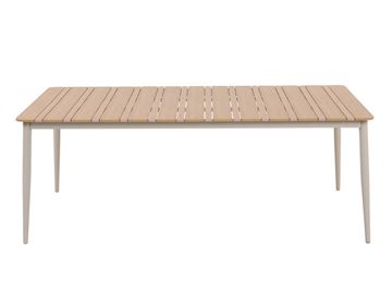 Bordet er bygget på et solidt aluminiumsstel med gråhvid pulverlakering, som giver et let og stilrent udtryk og samtidig sikrer høj modstandsdygtighed over for vind og vejr. Den lange bordplade i nonwood/polywood i naturlig træfarve tilfører varme og struktur til helheden – og kræver stort set ingen vedligeholdelse. Med en længde på 200 cm er der rigelig plads til tre stole på hver side, hvilket gør sættet ideelt til både hverdagsmiddage og større sommerarrangementer.
