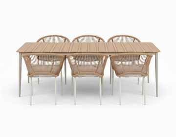 Skab en lys, indbydende og moderne spiseplads i haven med dette elegante havemøbelsæt, der kombinerer et robust havebord med seks komfortable stole i et harmonisk, nordisk design.