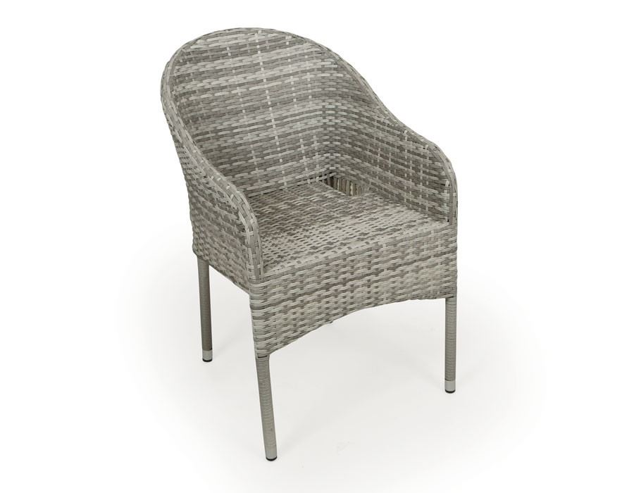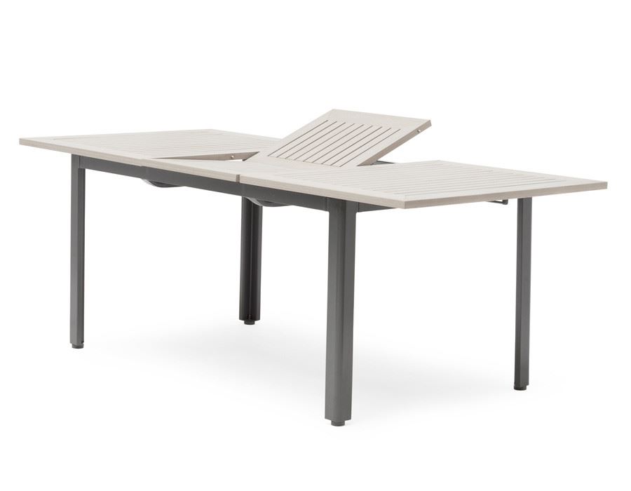 Havemøbelsæt med udtræksbord og seks stabelstole. Bordet har stel i gråt aluminium og en lysegrå bordplade i nonwood, som giver et elegant og tidløst udtryk. Det integrerede udtrækssystem gør det nemt at forlænge bordet, og tillægspladen opbevares diskret under bordpladen. Stolene har en solid stålramme og lys grå polyrattan flet i 2-line design. Den buede ryg og armlæn giver god komfort, og de vejrbestandige materialer gør sættet velegnet til både terrasse og have. Sættet kræver ingen vedligeholdelse.