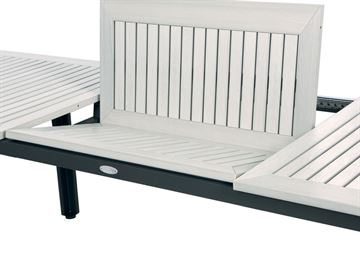 Havemøbelsæt med udtræksbord og seks stabelstole. Bordet har stel i gråt aluminium og en lysegrå bordplade i nonwood, som giver et enkelt og elegant udtryk. Det indbyggede udtrækssystem gør det nemt at forlænge bordet, og tillægspladen opbevares diskret under bordpladen. Stolene har en sort polyrattan flet i 4-line design og en solid stålramme. Den buede ryg og armlæn bidrager til en komfortabel siddeoplevelse. Materialerne er vejrbestandige og kræver ingen vedligeholdelse, hvilket gør sættet velegnet til både have og terrasse.