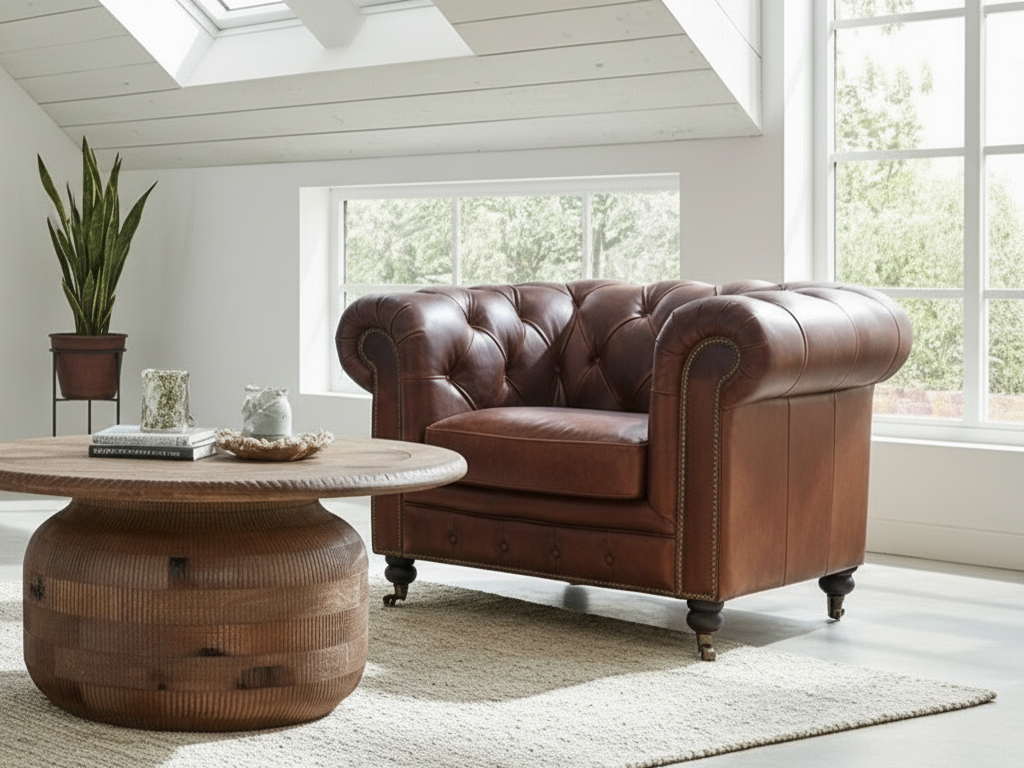 Denne imponerende Chesterfield-lænestol kombinerer tidløs britisk design med luksuriøs komfort. Betrukket med 100% ægte okselæder i farven Newark brown, har stolen et smukt patineret look, der kun bliver flottere med årene. Det dybe, håndlavede knapbetrukne ryglæn og de rullede armlæn giver den ikoniske Chesterfield-stil, mens de elegante messingnitter og de drejede træben med hjul tilfører et eksklusivt touch.