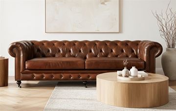 Oakland er en klassisk Chesterfield-sofa med plads til hele fire personer – udført i 100% ægte okselæder i farven Newark Brown. Det traditionelle knapbetrukne ryglæn, de runde armlæn og de dekorative messingnitter langs kanten fremhæver det ikoniske Chesterfield-design, mens de drejede ben i træ med små hjul fuldender det tidløse udtryk.