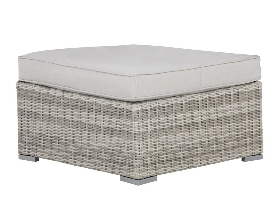 Sofabord med glasplade og hynde, fremstillet i aluminium med ekstra kraftig lys grå polyrattanflet.
