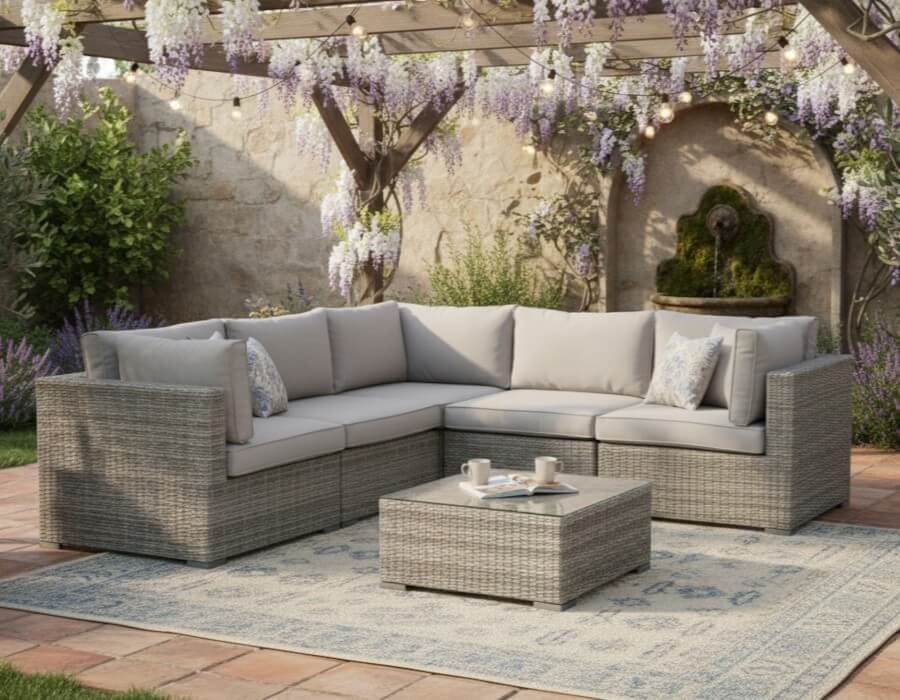 Havemøbelsæt med aluminiumsstel og ekstra kraftig lys grå polyrattan-flet. Det modulopbyggede design giver dig frihed til at sammensætte sofaen præcis efter dine ønsker.
