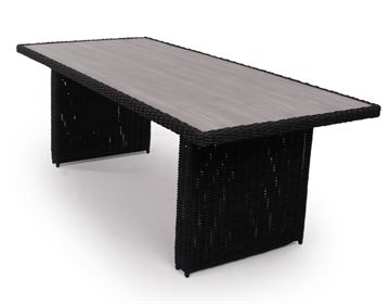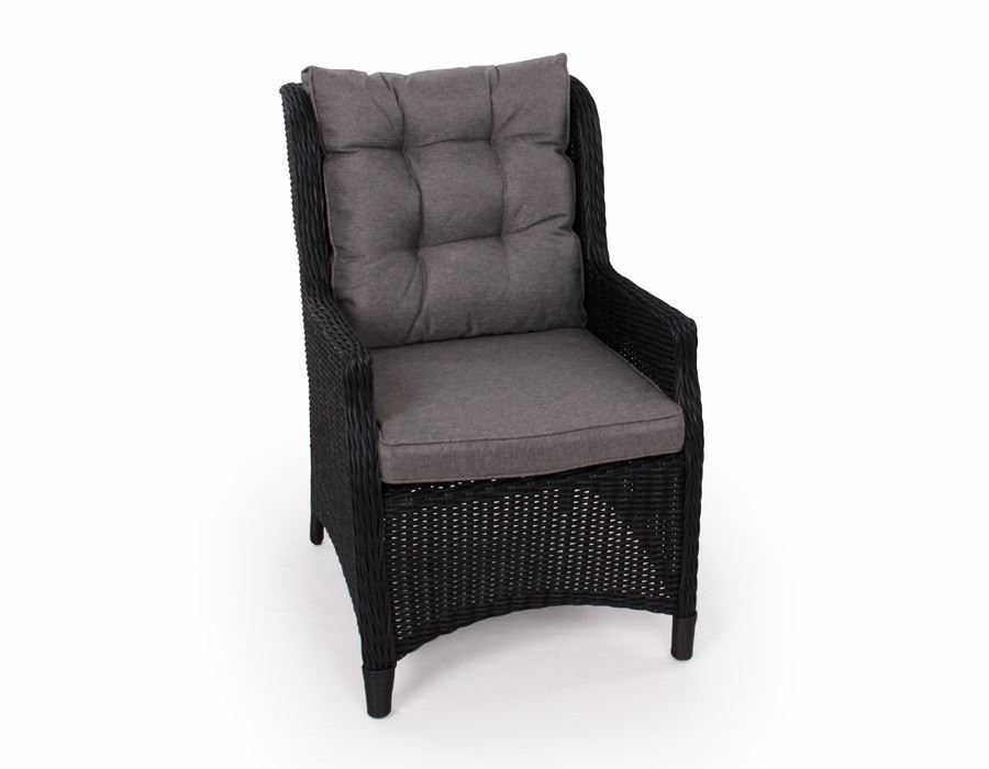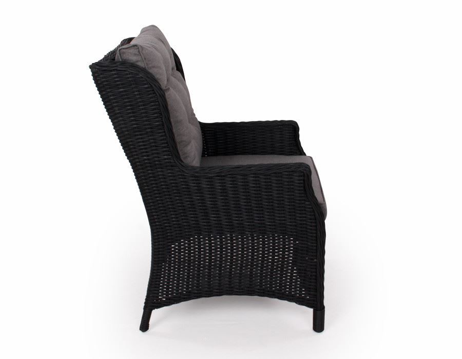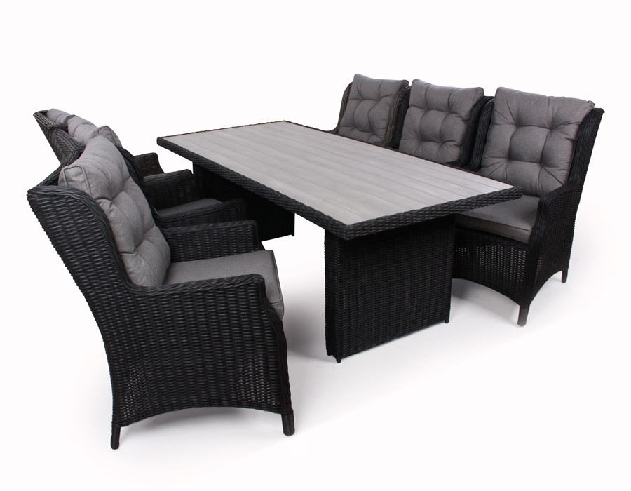 Elegant og slidstærkt havemøbelsæt i aluminium med kraftig sort polyrattanflet, der kombinerer stil og komfort.