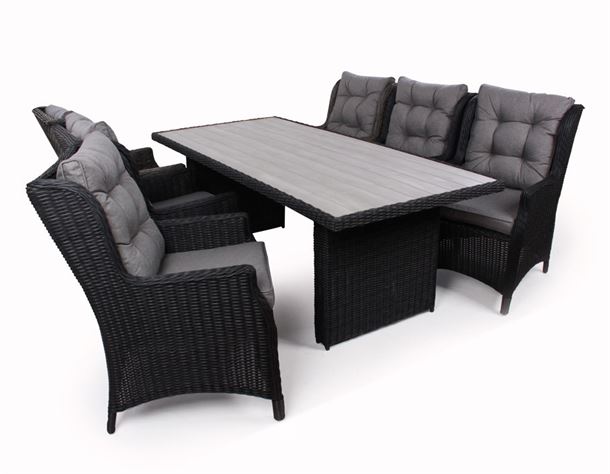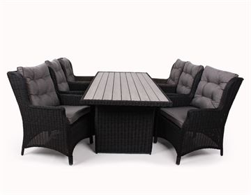 Sættet inkluderer 6 rummelige loungestole med luksushynder i gråt betræk samt et solidt bord med grå nonwood-lameller, der giver et moderne og vedligeholdelsesfrit design. Perfekt til afslapning og samvær i haven eller på terrassen.