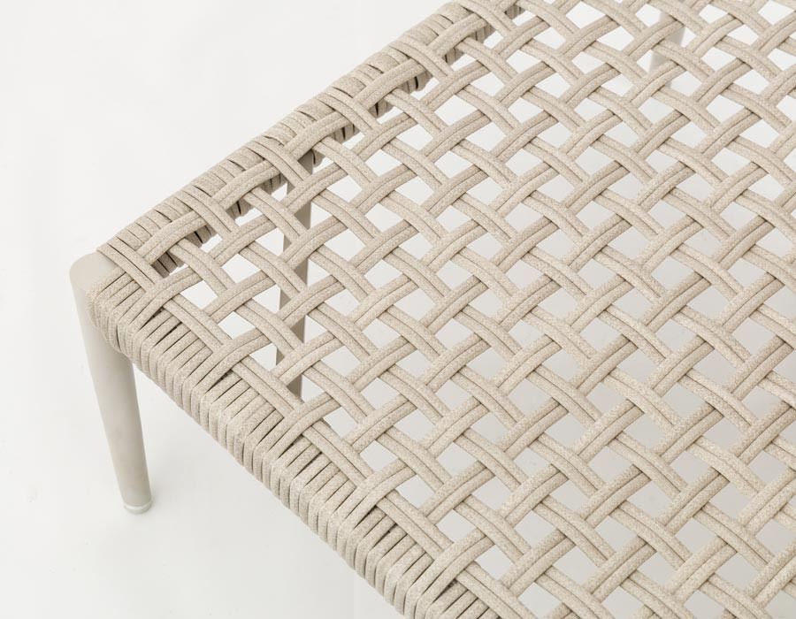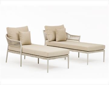 Det lette, eksklusive udtryk kommer fra det slanke aluminiumsstel, som gør møblet nemt at flytte rundt på efter solens stråler. De elegante sider er håndflettet i slidstærkt polyesterreb, der giver et moderne, luftigt look og er skabt til at modstå livet udendørs. Hynderne fuldender oplevelsen med blød, støttende komfort – og takket være deres vandafvisende overflade kan de sagtens klare både dug og en mild sommerbyge.