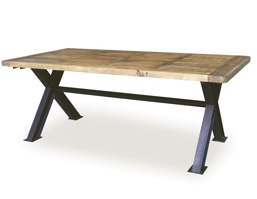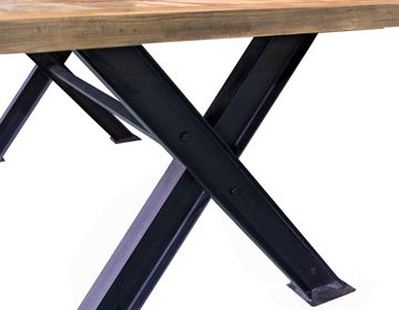 Spisebord med kraftig bordplade i genbrugselmetræ, der bringer varme og karakter ind i hjemmet. Træets naturlige patina og struktur giver et levende og autentisk udtryk, som klæder både moderne og klassiske indretninger. Bordet er udstyret med robuste X-formede ben, der understreger det solide og rustikke design.