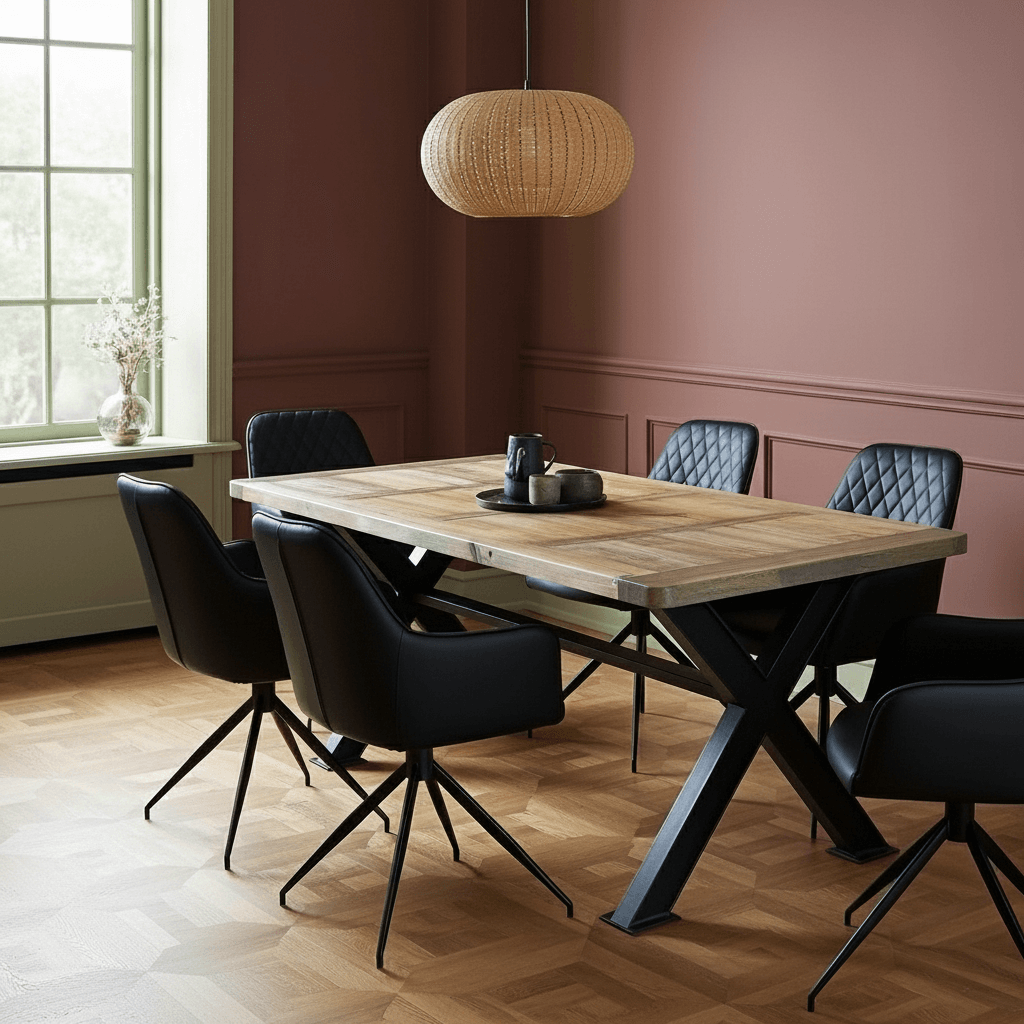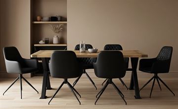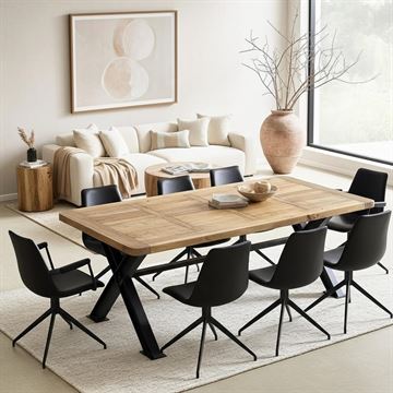 Det solide X-formede stel i metal understreger bordets robuste design og tilfører et industrielt touch, der balancerer det rustikke træ perfekt. Et ideelt samlingspunkt til hyggelige middage, kreative samtaler og hverdagslivets små øjeblikke.