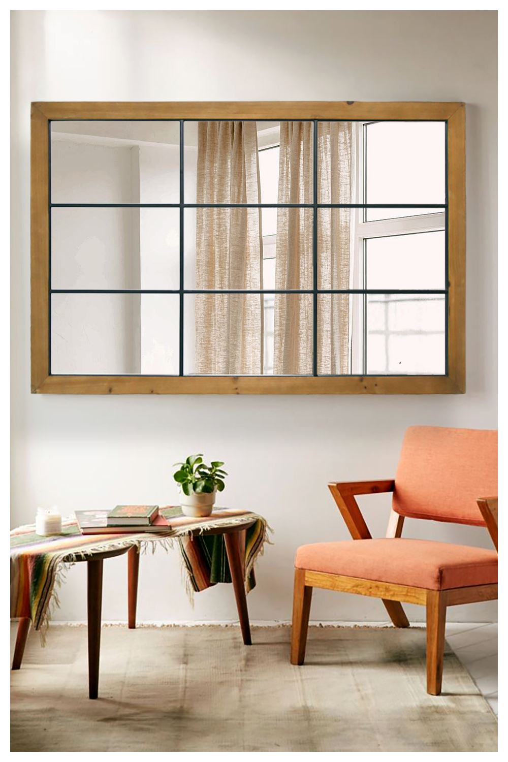 Stort og stilfuldt spejl med naturfarvet ramme i fyrretræ.