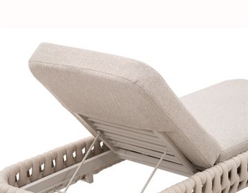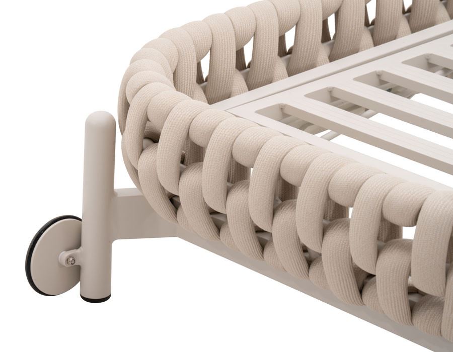 Det brede rope-flet giver et eksklusivt lounge‑udtryk, og det justerbare ryglæn gør det nemt at skifte mellem flad hvileposition og oprejst læsestilling. De diskrete hjul gør solvognen let at flytte rundt, så du altid kan fange solens bedste stråler.