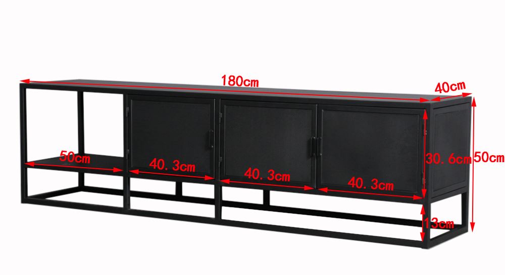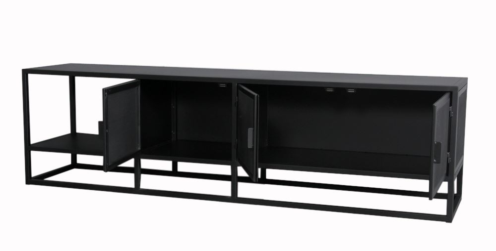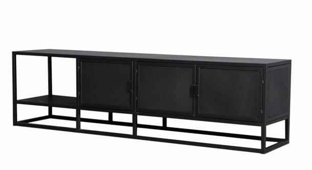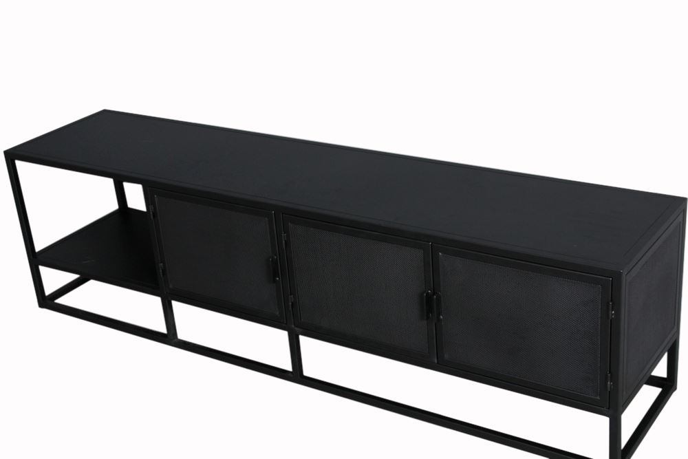 Tv bord udført i sortlakeret perforeret metal. Tre låger med perforeret metal. Greb af sortlakeret jern. Tv bordet er 180 cm lang. Industrielt design.